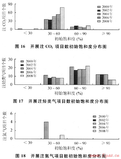從圖16~18中可以看出,近10a來世界范圍內(nèi)實(shí)施的注氣項(xiàng)目中,采用CO2,驅(qū)及氮?dú)怛?qū)的油藏初始飽和度取值范圍為30%~60%,注烴類氣為30%~90%。