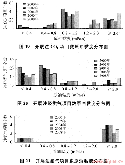 從圖19~21中可以看出:在成功進(jìn)行注CO2選擇原油黏度在0.80~1.20mPa·s范圍內(nèi)的油藏最多;在成功進(jìn)行注烴類氣選擇原油黏度小于0.80mPa·s的油藏最多;在成功進(jìn)行注氮?dú)獾捻?xiàng)目中,選擇原油黏度范圍要么較小(小于0.4mPa·s)要么較大(大于2mPa·s)。