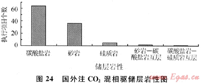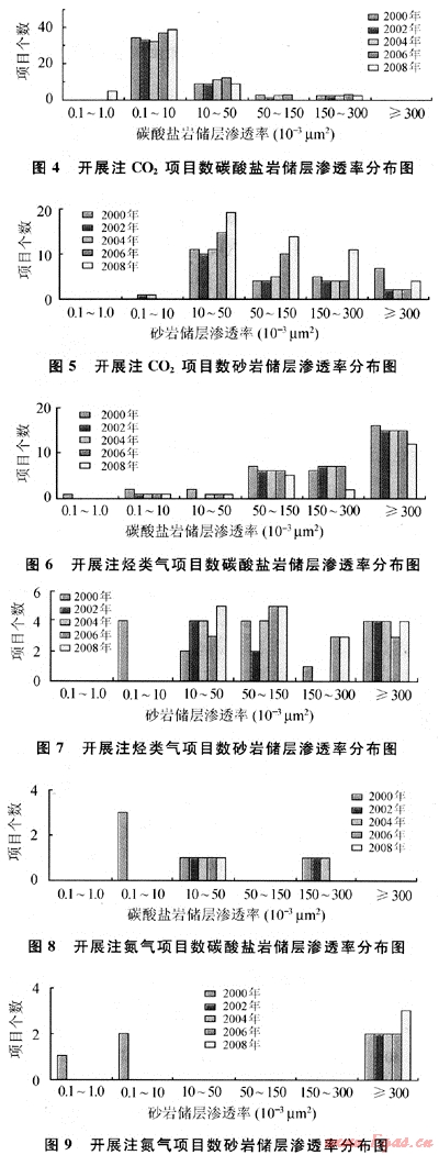 隨著全球?qū)O2排放引起大氣污染的日益重視,注CO2資源化利用潛力越來越大,其項(xiàng)目占了絕大部分。在我國開展了很多注CO2的吞吐項(xiàng)目,部分CO2驅(qū)也在實(shí)施。國家也很重視CO2排放及資源利用,專門批準(zhǔn)“973”項(xiàng)目“溫室氣體提高石油采收率的資源化利用及地下埋存”,還設(shè)置了國家重大專項(xiàng)和“863”重點(diǎn)項(xiàng)目,對CO2埋存及資源化利用的各個方面進(jìn)行了全面研究。但我國目前大多數(shù)項(xiàng)目都未實(shí)現(xiàn)CO2混相驅(qū)。對國外2008~2009年注CO2混相驅(qū)的108個項(xiàng)目進(jìn)行統(tǒng)計,表明國外注CO2混相驅(qū)原油黏度主要分布在0.8~1.2mPa·s,溫度主要分布在30~60℃,儲層深度在600~2000m的較多,碳酸鹽巖注氣滲透率主要在(0.1~10)×10-3μm2及(10~50)×10-3μm2范圍內(nèi),砂巖中注CO2是滲透率大于10×10-3μm2的油藏。可見國外主要是對碳酸鹽巖油藏進(jìn)行混相驅(qū)(圖24)。當(dāng)然其原油組成對混相壓力影響也較大,但由于沒有公布的數(shù)據(jù),因此這里未列出[9~10]。