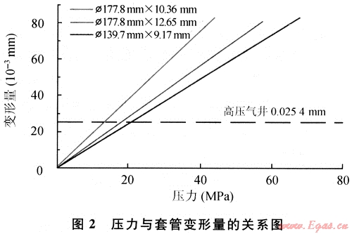 式中:ro為套管外徑,mm;ri為套管內(nèi)徑,mm;pi為套管受內(nèi)壓力,MPa;σr為徑向應(yīng)力,MPa;σθ為切向應(yīng)力,MPa;σz為軸向應(yīng)力,MPa;△L為變形量,mm。