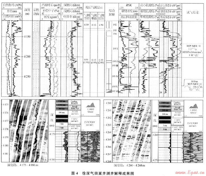 利用上述方法編制常規(guī)測井資料識別裂縫發(fā)育程度評價程序和裂縫參數(shù)計算程序,并對研究區(qū)若干井進行了計算,圖4是其中一口井的處理解釋結果:195Ⅰ層TCP+MFE-Ⅰ測試,日產氣105876m3,該層地層因數(shù)比值為15.6,裂縫角度指示參數(shù)為1.9,顯示該層高角度裂縫較發(fā)育,裂縫張開度1150.5μm,裂縫孔隙度0.11%,裂縫滲透率310.9×10-3μm2,F(xiàn)MI圖像顯示195Ⅰ層垂直縫和高角度縫發(fā)育,核磁測井T2分布譜顯示為30ms以上的大孔隙,表明本層裂縫提供了極好的流體滲流通道,使得儲層在自然測試時能達到高產。下部195Ⅴ、195Ⅵ兩層地層因數(shù)比值29.9,裂縫角度指示參數(shù)0.5,顯示該段地層發(fā)育40°~70°的傾斜裂縫,測井計算的裂縫張開度為9.8μm,裂縫孔隙度0.02%,裂縫滲透率0.002×10-3μm2,表明該段地層裂縫雖然發(fā)育,但為無效縫或裂縫的徑向延伸較淺,沒有起到溝通流體滲流通道的作用,對產能沒有貢獻。FMI圖像顯示195Ⅴ、195Ⅵ兩層存在誘導縫特征,徑向延伸短,裂縫開度小,是無效縫。核磁測井T2分布譜顯示小于30ms的束縛水孔隙,地層裂縫被低阻泥質充填。該段地層經TCP+MFE-Ⅰ測試,日產氣106m3。