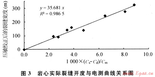 巖心實際裂縫開度(經壓敏校正)與電測值關系(圖3)表明:A=3.5×104,比理論值高,說明工區(qū)低角度縫很少。當出現(xiàn)低角度縫且Cs<Cd時,公式中的(Cs-Cd)換成(Cd-Cb),其中,Cb為基巖塊電導率,從與解釋層鄰近的非裂縫性地層讀取,裂縫愈發(fā)育,側向測井比基質電阻率降得愈低。