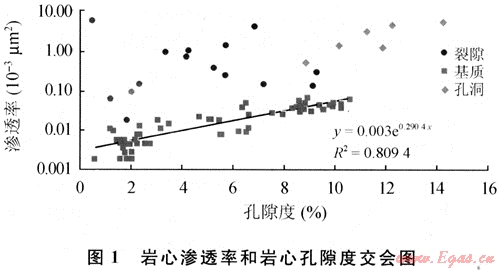 徐深氣田火山巖儲層野外露頭觀測發(fā)現(xiàn),構造裂縫和原生收縮縫普遍發(fā)育[2~3]。根據(jù)巖心的宏觀和微觀統(tǒng)計,該區(qū)裂縫以高角度斜交裂縫和垂直裂縫為主,所占比例分別為35%和45%;低角度裂縫和水平裂縫發(fā)育程度較低,只占16%和4%。巖心觀測表明,在2804條裂縫市有62.8%是開啟的,裂縫張開度平均值0.1mm。利用全直徑巖心分析數(shù)據(jù),建立巖心滲透率和巖心孔隙度交會圖(圖1),圖版中明顯低孔、高滲的點代表裂縫發(fā)育,為裂縫發(fā)育區(qū)。巖心觀測和分析表明:徐深氣田火山巖儲層為裂縫-孔隙型儲層。