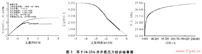 最終得到了該井表皮系數(shù)為-3.16,說明是壓裂后受效井,表皮系數(shù)較??;分析該井地層模型為復(fù)合地層,內(nèi)區(qū)滲透率為0.39mD,內(nèi)區(qū)半徑為39.7m,說明近井地帶40m左右是壓裂后滲透性改善區(qū);而外區(qū)滲透率0.2426mD,說明壓裂縫外圍地層的滲透情況。