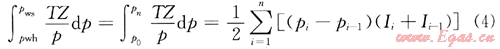 對式(2)的右邊進行數(shù)值積分,把(pws,pwh)段平均分作n個壓力段(pi-1,pi){i=1,2,3,…,n;p0=pwh,pn=pws),并使每個壓力段的步長足夠小,則有: