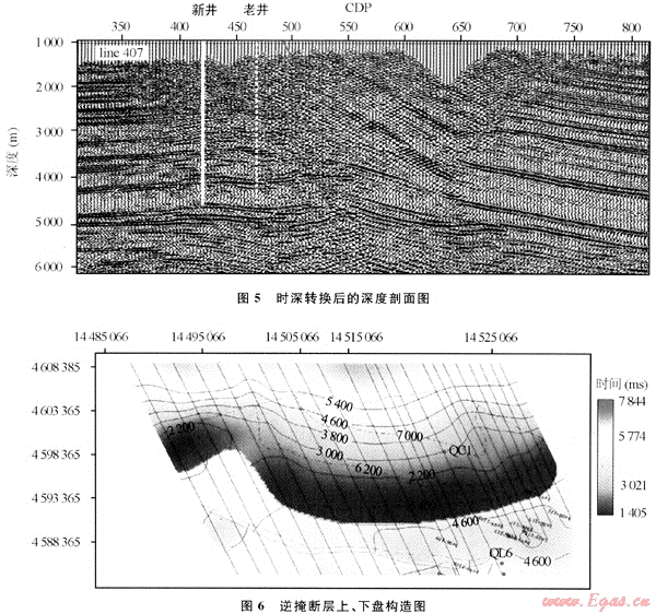 GeoMountain解釋軟件系統(tǒng)在10多個項目中得到了廣泛應(yīng)用,取得較好效果。圖4為西部某工區(qū)構(gòu)建的地下速度模型,經(jīng)時深轉(zhuǎn)換后得到深度剖面。由于準(zhǔn)確的速度場構(gòu)建,消除了時間剖面的構(gòu)造假象,恢復(fù)了地下復(fù)雜構(gòu)造的真實(shí)形態(tài)(圖5)。圖6為某層的逆掩斷層構(gòu)造成圖,它同時刻畫了斷層上、下盤包括逆掩部分的構(gòu)造形態(tài)。