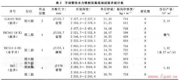 在前期大量有效研究的基礎(chǔ)上,共完成了4口井的現(xiàn)場試驗(yàn)。試驗(yàn)結(jié)果表明:目前已經(jīng)形成了井深3000m以內(nèi)的不動管柱水力噴射壓裂工藝及配套技術(shù);研制的井下工具工作壓力達(dá)到60MPa、工作溫度達(dá)到90℃,在Φ178、Φ139.7mm兩種套管和Φ215.9、Φ152.4mm兩種裸眼使用。試驗(yàn)井實(shí)現(xiàn)不動管柱壓裂3~4條縫,單縫壓裂成功率100%。返排后,投產(chǎn)順利,其中HC001-6-H1井實(shí)現(xiàn)了3段合采,865井實(shí)現(xiàn)了3層(4段)合采(表2)。