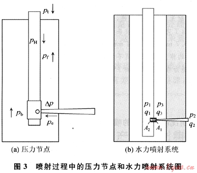 按照節(jié)點(diǎn)方法來分析,涉及井下壓力節(jié)點(diǎn)的有以下幾個(圖3-a):①裂縫延伸壓力(pp);②噴嘴前井底壓力(pb);③管路摩阻(pf);④靜水柱壓力(pH);⑤井口泵壓(pt)。