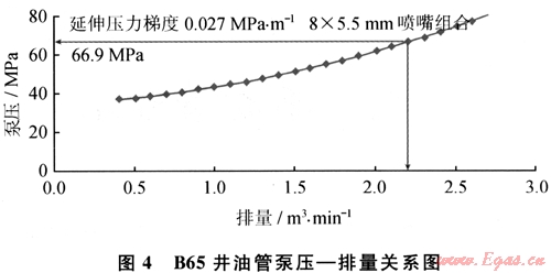 由于裂縫延伸壓力(pp)、管路摩阻(pf)、靜水柱壓力(pH)都是不難得到的參數(shù),因此,只要按照式(3)計算噴嘴壓降,就可以根據(jù)式(2)計算出施工時的地面泵壓。以B65井為例,得到油管泵壓 排量關(guān)系圖版(圖4)。