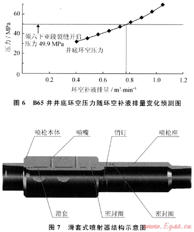 如圖6所示,在設(shè)計865井須六上亞段水力噴射壓裂時,當(dāng)環(huán)空補(bǔ)液排量達(dá)到0.7m3/min,井底環(huán)空壓力就超過已經(jīng)壓裂的須六下亞段的裂縫開啟壓力,因此須六上亞段的環(huán)空補(bǔ)液排量的上限就是0.7m3/min。