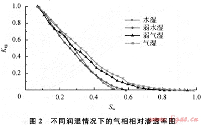 圖2給出了不同潤(rùn)濕條件下的氣相相對(duì)滲透率曲線。在每一飽和度下,水濕巖樣的氣相相對(duì)滲透率總比氣濕巖樣的氣相相對(duì)滲透率低很多,這給出了一個(gè)可在油田應(yīng)用的潛在方法:對(duì)致密氣藏,改變近井地帶的潤(rùn)濕性,使其由水濕變?yōu)闅鉂?,可以增加氣體的滲流能力,提高產(chǎn)量或注入量。值得注意的是,當(dāng)水飽和度大于0.4時(shí),氣體的相對(duì)滲透率按照水濕→弱水濕→弱氣濕→氣濕的順序依次增加;但當(dāng)水飽和度小于0.4時(shí),相對(duì)滲透率增加的次序性被打亂,在弱水濕情況下表現(xiàn)為最小。