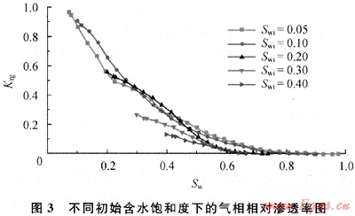 3) 初始含水飽和度對(duì)氣相相對(duì)滲透率有明顯的影響,隨著初始含水飽和度增加,氣相相對(duì)滲透率總體呈下降趨勢(shì)。