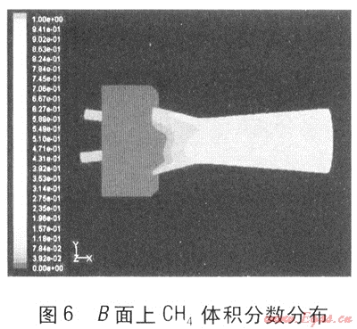 圖6為引射器B面上CH4的體積分數(shù)分布。在噴嘴內(nèi)CH4體積分數(shù)為100%。在吸氣收縮管內(nèi),CH4體積分數(shù)逐步增加,并引射一部分空氣進入引射管。經(jīng)過喉部后,在擴壓管部分,CH4與空氣混合均勻,體積分數(shù)趨于穩(wěn)定。