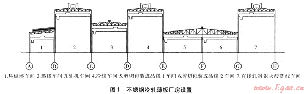 項目建設(shè)地點位于太鋼廠區(qū),由于在太鋼老廠區(qū)進行建設(shè),項目場地狹窄,在總圖布置上考慮了新建2250mm熱連軋與新建不銹鋼冷軋主工藝流程的特點,并結(jié)合場地實際情況,熱鋼卷由地下運輸鏈直接運至熱板坯車間,減少了兩個廠房的地面運輸用地。