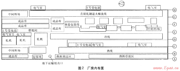 不銹鋼冷軋薄板工程占地面積約14×104m2,廠房總長度為690m,總寬度為204m,由相鄰的多跨車間組成。總建筑面積為12.861×104m2,其中熱板坯車間建筑面積為14490m2,該車間不供暖。其他車間建筑面積為11.412×104m2,為供暖區(qū)域。由于供暖區(qū)域內(nèi)包括磨輥間、變電站、成品庫等不需供暖的部位,因此為簡化問題,供暖面積按11×104m2考慮。不銹鋼冷軋薄板廠房設(shè)置及廠房內(nèi)布置分別見圖1、2。