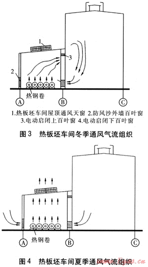 經(jīng)計算得,熱板坯車間的余熱量為53.44MW。在冬季,為充分利用該余熱,考慮在該車間加強氣流組織,依靠自然通風(fēng)系統(tǒng),在滿足該車間冬季室內(nèi)溫度要求外,對相鄰的熱線車間通過熱氣流組織,提供部分余熱,降低熱線車間的供暖能耗。冬夏季兩種工況下,熱板坯車間通風(fēng)氣流組織分別見圖3、4。在冬季,熱板坯車間電動啟閉上、下百葉窗開啟,屋頂通風(fēng)天窗、防風(fēng)沙外墻百葉窗關(guān)閉,熱氣流流向熱線車間。在夏季,電動啟閉上百葉窗關(guān)閉,屋頂通風(fēng)天窗開啟排風(fēng),電動啟閉下百葉窗及防風(fēng)沙外墻百葉窗開啟進風(fēng),可將大量余熱排往室外,消除熱鋼卷散熱對熱板坯車間產(chǎn)生的高溫影響,保證現(xiàn)場工人身體健康。