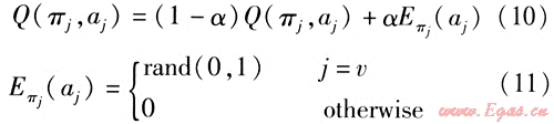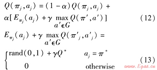假設(shè)信息素模型(包括信息素更新規(guī)則、強(qiáng)化信號(hào)等)和狀態(tài)轉(zhuǎn)移規(guī)則均未知,則對(duì)所優(yōu)化問(wèn)題的每一個(gè)節(jié)點(diǎn)j都賦以Q值(行為一狀態(tài)對(duì)),用Q值取代螞蟻信息素作為決策信息,通過(guò)對(duì)Q函數(shù)變化規(guī)律的學(xué)習(xí)不斷逼近最優(yōu)策略。