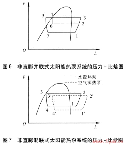 直膨式、非直膨并聯(lián)式、非直膨混聯(lián)式太陽能熱泵系統(tǒng)的壓力-比焓(p-h)圖見圖5~7。由圖5可知,在直膨式太陽能熱泵系統(tǒng)中,由冷凝器出來的工質(zhì)經(jīng)過膨脹閥節(jié)流(4-1)后到達太陽能集熱器,吸收太陽能后氣化(1-2),再進入壓縮機壓縮后變?yōu)楦邷馗邏旱臍怏w(2-3),最后進入冷凝器放熱(3-4)。