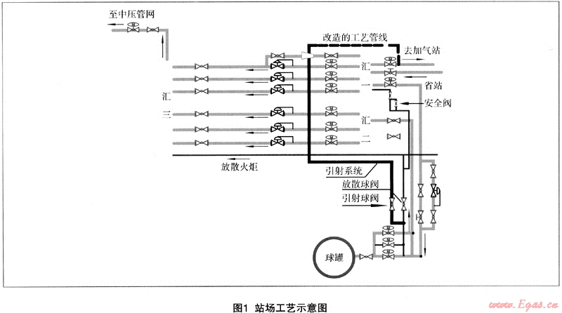 把站場引射器下方管線和加氣站進氣管道連接起來,關(guān)閉匯一集氣罐上到加氣站去的球閥。這樣就用球罐存氣通過引射管道供光明村加氣站運行,球罐晚間進氣到高壓0.92MPa,白天通過引射管線供加氣站。見圖1。