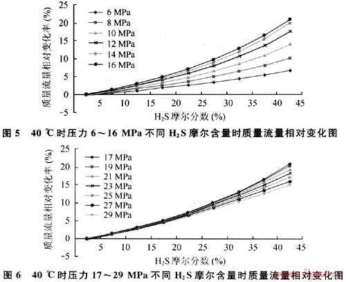 圖5、6分別給出了基于前述基準條件,40℃時壓力為6~16MPa、17~29MPa和不同HzS摩爾含量時質(zhì)量流量變化情況。可見質(zhì)量流量變化主要受到H2S含量的影響,均隨H2S摩爾分數(shù)增加而增加。相同H2S摩爾分數(shù)時,6~16MPa的質(zhì)量流量隨壓力增加的變化速度明顯加快,而在19~29MPa范圍時又隨壓力增加變化速度變慢。