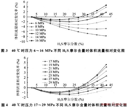 圖3、4分別給出了基于前述基準條件,40℃時壓力為6~16MPa、17~29MPa和不同H2S摩爾分數(shù)含量時體積流量相對變化情況。由圖3、4可知:在所列H2S摩爾分數(shù)范圍內(nèi),隨著H2S含量增加,6~8MPa范圍內(nèi)體積流量變化始終負增長,呈下降趨勢;12~16MPa,17~27MPa的體積流量變化均開始負增長,后正增長;10MPa時與29MPa時類似,分別在H2S摩爾分數(shù)為25%、20%附近時體積流量降至最低,分別降低3%和1.6%。