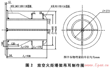 經(jīng)過核算,放空火炬塔架上、下段吊耳均選擇兩個(gè)管軸式吊耳,管軸采用Ø273mm×12mm無縫鋼管,材質(zhì)Q345B,其余材質(zhì)Q235B,吊耳懸臂長度400mm,吊耳制作如圖2所示。