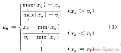 一般情況下,指標(biāo)按性質(zhì)可分為正指標(biāo)、逆指標(biāo)和中性指標(biāo)。此外,由于不同指標(biāo)之間的量綱不一樣,因而也必須對(duì)指標(biāo)數(shù)據(jù)進(jìn)行無量綱化處理。根據(jù)指標(biāo)性質(zhì)分別為3種類型指標(biāo)設(shè)計(jì)了相應(yīng)的指標(biāo)處理函數(shù)。