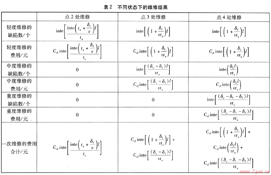 在表2中,因?yàn)闄z測間隔以a為單位,所以將檢測間隔取整后,檢測間隔小于實(shí)際計(jì)算值,最大缺陷在檢測時(shí)沒有達(dá)到狀態(tài)點(diǎn)劃分的尺寸值,故對于點(diǎn)3處進(jìn)行維修時(shí),中度維修的最大缺陷為δx,δx由下式確定: