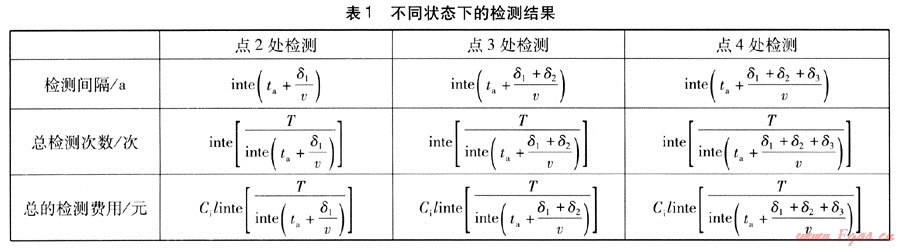 在運(yùn)行過程中,因?yàn)槿毕莸漠a(chǎn)生是隨機(jī)過程,所以很難把握圖中點(diǎn)l的狀態(tài),即防腐層一旦失效便進(jìn)行檢測修復(fù),所以從點(diǎn)2狀態(tài)開始分析,各狀態(tài)的分析結(jié)果見表1,表中T(單位為a)為管道的使用壽命,l(單位為km)為所計(jì)算管段的長度。由于檢測間隔和檢測次數(shù)為整數(shù),定義函數(shù)inte[f(x)]為f(x)值的整數(shù)部分,若計(jì)算所得檢測次數(shù)為整數(shù),按實(shí)際運(yùn)行壽命中檢測發(fā)生的次數(shù),最后一次檢測(即管道運(yùn)行時(shí)間已到使用壽命時(shí)進(jìn)行的檢測)不考慮進(jìn)檢測維修規(guī)劃中,則實(shí)際發(fā)生的檢測次數(shù)應(yīng)為計(jì)算值減去1,在以下的計(jì)算中檢測間隔和檢測次數(shù)都按照這個(gè)方法進(jìn)行計(jì)算。