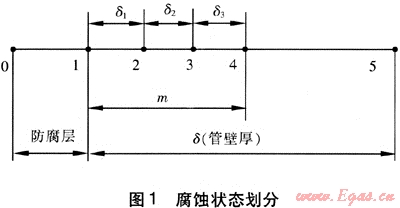 沿壁厚方向?qū)⑷毕莸陌l(fā)展劃分成4個(gè)階段,見圖1。在模型的實(shí)際應(yīng)用過程中,可根據(jù)實(shí)際供選擇的維修方式進(jìn)行腐蝕階段和維修種類的劃分。用△δ表示缺陷的腐蝕深度,在圖1中的點(diǎn)4處,腐蝕深度達(dá)到最大,即δ1+δ2+δ3=m。