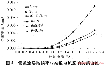 金屬管道埋地深度為h=2cm,管道與電阻絲水平凈距為d=20cm,土壤電阻率為ρ=30.10Ω·m,涂層破損率分別為θ=1%、0.5%、0.1%。在上述條件下,管道涂層破損率對(duì)雜散電流影響關(guān)系曲線見(jiàn)圖4。從圖4可以看出,在一定土壤電阻率條件下,隨著管道涂層破損率的增大,在相同外加電流條件下,管道內(nèi)的雜散電流也逐漸增大。因此,要減小管道內(nèi)雜散電流,就必須降低埋地金屬管道的涂層破損率,提高其表面防護(hù)性能,減少雜散電流對(duì)埋地金屬管道的腐蝕危害。