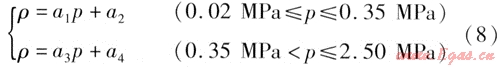 對于飽和蒸汽的熱力性質(zhì),國際水和蒸汽性質(zhì)協(xié)會(IAPWS)在1997年建議開始使用新的水和蒸汽熱力性質(zhì)的IAPWS工業(yè)公式(簡稱為IAPWSIF97)[3],該公式是為了滿足動力工業(yè)的需要而制定的,參數(shù)適用范圍大,表達(dá)式復(fù)雜。而常用供熱系統(tǒng)所用蒸汽壓力比動力系統(tǒng)低得多,范圍也小得多,因此在供熱系統(tǒng)常用壓力范圍內(nèi)對狀態(tài)參數(shù)進(jìn)行擬合。考慮到工程應(yīng)用中以采用相對壓力為主,這里對相對壓力范圍0.02~2.50MPa的飽和蒸汽進(jìn)行擬合,得到密度與相對壓力的關(guān)系式: