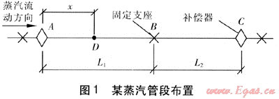 某蒸汽管段布置見圖1。長(zhǎng)度為L(zhǎng)1、L2的兩段直管段,設(shè)置3個(gè)固定支座和兩個(gè)波紋管補(bǔ)償器A、C。設(shè)暖管前鋼管溫度為θ1、暖管蒸汽溫度為θ2、管道單位長(zhǎng)度質(zhì)量為ml。蒸汽由A端進(jìn)入,流速為v。與直徑相比,鋼管的壁厚較小,且鋼材的熱導(dǎo)率較大,忽略管壁的溫升過程,即按蒸汽到達(dá)之處管壁溫度與蒸汽溫度相同考慮。當(dāng)暖管蒸汽到達(dá)點(diǎn)A,并從點(diǎn)A繼續(xù)向前流動(dòng)一段距離菇到達(dá)點(diǎn)D時(shí),管段AD伸長(zhǎng)量的計(jì)算式為: