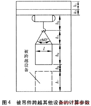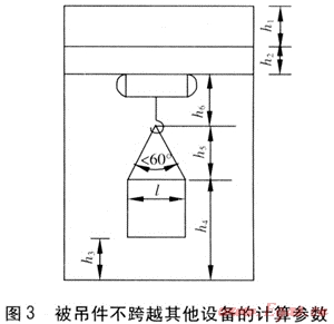 對(duì)于被吊件跨越其他設(shè)備的情況,起升高度需滿(mǎn)足被吊件底部距其所跨越設(shè)備頂部的距離不小于500mm,計(jì)算參數(shù)見(jiàn)圖4。
