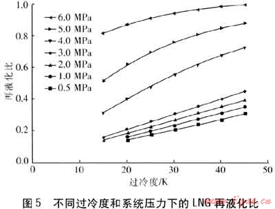 ③ 通過HYSYS軟件模擬,認(rèn)為LNG再液化工藝是可行的,得出了再液化比與過冷度、系統(tǒng)壓力的關(guān)系,有力地論證了理論分析的合理性。