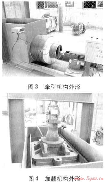 沙箱試驗(yàn)機(jī)由沙箱、加載機(jī)構(gòu)、牽引機(jī)構(gòu)、電氣控制、測(cè)力傳感器、行程開關(guān)、計(jì)算機(jī)等部分組成。沙箱試驗(yàn)機(jī)結(jié)構(gòu)見圖2,牽引機(jī)構(gòu)、加載機(jī)構(gòu)外形分別見圖3、4。牽引機(jī)構(gòu)由擺線針輪減速機(jī)、電動(dòng)機(jī)、傳動(dòng)部件等組成,牽引機(jī)構(gòu)通過測(cè)力傳感器與工作管相連。試驗(yàn)時(shí)牽引機(jī)構(gòu)在行程開關(guān)的配合下使工作管作直線往復(fù)運(yùn)動(dòng)(每個(gè)行程100mm),測(cè)力傳感器通過顯示器顯示推力、拉力。沙箱試驗(yàn)機(jī)可在空載、加載狀況下進(jìn)行操作,在進(jìn)行加載試驗(yàn)時(shí)通過千斤頂對(duì)試件加載,加載力傳感器通過顯示器顯示加載力。由計(jì)算機(jī)計(jì)算空載時(shí)平均推(拉)力與加載時(shí)平均推(拉)力的比值。沙箱兩側(cè)焊接20號(hào)槽鋼,并焊接橫梁支撐,便于安裝千斤頂(見圖4)。沙箱底部設(shè)置與牽引機(jī)構(gòu)、電控及儀表箱相連的支座。