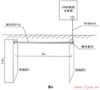 (3) 接地是通過(guò)金屬導(dǎo)線(xiàn)與接地裝置連接,將電氣設(shè)備和其他生產(chǎn)設(shè)備上可能產(chǎn)生的漏電流、靜電荷以及雷電電流等引入地下。遠(yuǎn)程抄表系統(tǒng)主要有兩種接地,一是防雷接地,二是屏蔽接地。防雷接地是將220V電源浪涌接地、24V電源浪涌接地、信號(hào)浪涌接地、流量計(jì)表頭感應(yīng)電接地。屏蔽接地是將RS485信號(hào)線(xiàn)屏蔽接地,防止高頻信號(hào)或雜波信號(hào)干擾影響DTU正常工作。與建筑物共用防雷接地體接地電阻應(yīng)小于1Ω;單獨(dú)使用鍍鋅角鋼打接地樁的接地電阻應(yīng)小于4Ω。與接地體連接的接地線(xiàn)應(yīng)使剛6mm2以上的BVR銅芯軟線(xiàn)或銅編織線(xiàn)。單根接地樁接地電阻達(dá)不到4Ω的,打接地樁應(yīng)選擇土層厚實(shí)、雜物較少的地方。單獨(dú)打一根接地樁無(wú)法滿(mǎn)足接地電阻要求,則應(yīng)再增加接地樁,直至滿(mǎn)足接地電阻要求。相鄰兩根接地樁之間的距離不應(yīng)小于2m。接地樁之間應(yīng)使用相同規(guī)格的角鋼焊接或使用6mm2以上的BVR銅芯軟線(xiàn)連接,并用螺絲緊固。其結(jié)構(gòu)如圖4。