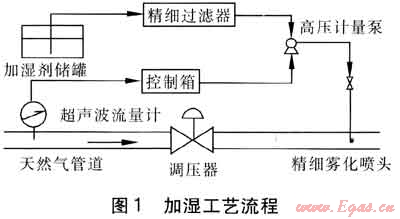 結(jié)合青島市燃?xì)夤芫W(wǎng)的實際運(yùn)行情況,自行設(shè)計了噴霧加濕工藝流程,見圖1。