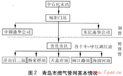 青島市燃?xì)夤芫W(wǎng)的基本情況見圖2。市區(qū)所使用的天然氣主要來自中石化末站,經(jīng)過城陽門站計量后,分別供給青島市區(qū)、中即港華公司和東億港華公司。中即港華公司和東億港華公司所建管網(wǎng)全部采用鋼管,不存在接口漏氣現(xiàn)象,因此不需要加濕。進(jìn)入市區(qū)的天然氣先經(jīng)過21km輸氣管道后分到各中-中壓調(diào)壓站,經(jīng)調(diào)壓后進(jìn)入中壓B管網(wǎng)。這21km輸氣管道也全部是鋼管,因此也不存在接口漏氣現(xiàn)象。