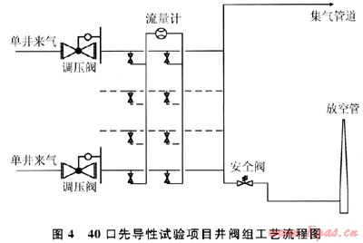40口先導(dǎo)性試驗項目井中,氣體進入閥組后,首先經(jīng)過調(diào)壓閥調(diào)壓,壓力調(diào)整為0.2MPa,單井產(chǎn)氣可利用閥門倒換流程,進行單井產(chǎn)氣輪換計量。所有氣體匯集到生產(chǎn)匯管后進入集氣管道,輸至集氣站。在生產(chǎn)匯管上安裝有安全閥,當壓力超過0.4MPa時,安全閥自動跳起。閥組中單井流量數(shù)據(jù)通過光纜傳輸至監(jiān)控中心。該工藝流程如圖4所示。