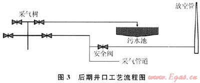 在該段流程中,水通過抽油機從油管中抽出,直接排放到井場附近的排污池,自然蒸發(fā)。煤層氣從套管和油管間的環(huán)形空間產(chǎn)出,通過采氣管道,進入煤層氣采集系統(tǒng),系統(tǒng)壓力為0.2MPa。當采氣系統(tǒng)檢修時,打開放空閥,通過放空管把井口里的煤層氣連續(xù)排放到大氣中。該井口工藝流程及如圖3所示。