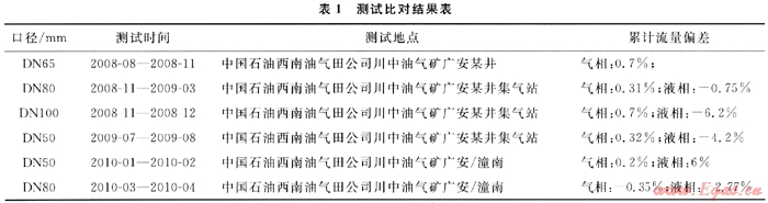 2010年初橇裝式凝析天然氣兩相流量計(jì)在巾國(guó)石油西南油氣田公司川中油氣礦合川區(qū)塊開始使用,從為期1a的測(cè)井?dāng)?shù)據(jù)看,計(jì)量效果較好,氣相測(cè)量誤差在±2%以內(nèi),液相測(cè)量誤差在±10%以內(nèi)。