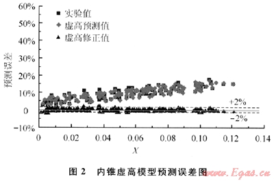 圖2為內(nèi)錐節(jié)流裝置虛高模型預(yù)測(cè)誤差圖,圖3為文丘里節(jié)流裝置虛高模型預(yù)測(cè)誤差圖,兩節(jié)流裝置虛高模型的虛高修正誤差在±1%以內(nèi)。