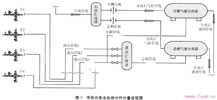 目前,我國(guó)井口天然氣計(jì)量現(xiàn)狀主要有以下3種情況:①利用分離法遠(yuǎn)端分時(shí)計(jì)量;②傳統(tǒng)的單相測(cè)量?jī)x表計(jì)量;③根本不計(jì)量。傳統(tǒng)的分離法計(jì)量是將若干個(gè)氣井產(chǎn)物分別采用獨(dú)立管線集中輸送到遠(yuǎn)端中心集氣站,由集氣站內(nèi)的氣液分離設(shè)備對(duì)分離后的氣液兩相分別進(jìn)行計(jì)量,其流程如圖1所示,通過對(duì)進(jìn)站閥組流程的切換實(shí)現(xiàn)遠(yuǎn)端天然氣氣井的流量分時(shí)測(cè)量。這種方法存在流程復(fù)雜、占地廣、設(shè)備龐大、成本高、需要獨(dú)立敷設(shè)輸送管線和不能實(shí)現(xiàn)對(duì)每口井實(shí)時(shí)計(jì)量等問題。