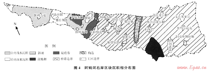 在阿姆河右岸地區(qū)西北部H2S含量普遍較高的背景下,有少量氣田H2S含量低,這些低H2S含量的氣田,正好位于開闊臺(tái)地深水沉積區(qū)(圖4),沉積物較細(xì),類似于東南部高伽馬泥巖層,有較好的封隔性能,從而阻止了烴類和膏鹽巖的直接接觸,硫酸鹽熱化學(xué)還原反應(yīng)不能夠大量發(fā)生,造成H2S含量較低。