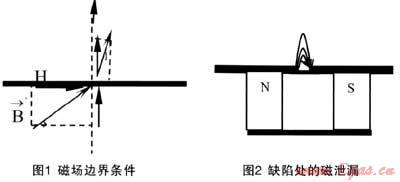 當(dāng)鐵磁性物體被磁化時(shí),缺陷處的磁力線會(huì)出現(xiàn)外溢現(xiàn)象,外溢量的大小同材料性質(zhì)、被檢物體的幾何形狀、缺陷的幾何形狀都有關(guān)系。對(duì)于檢測儀器而言外溢量越大則越容易檢測到缺陷。當(dāng)磁場由不同磁性物質(zhì)界面穿越時(shí),由于磁場特性H對(duì)于無自由電流分布的介質(zhì)是連續(xù)的即▽×H=0、▽·B=0,另外表面切向方向磁場強(qiáng)度為ht2,切向方向的磁感應(yīng)強(qiáng)度為bt2,內(nèi)表面切向分量的磁場強(qiáng)度為ht1切向方向的磁感應(yīng)強(qiáng)度為bt1;另材料外表面法向方向的磁感應(yīng)強(qiáng)度為bn2法向方向的磁場強(qiáng)度為hn2而材料內(nèi)表面磁感應(yīng)強(qiáng)度為bn1法向方向的磁場強(qiáng)度為hn1。所以對(duì)于材料內(nèi)外表面切向方向的磁場強(qiáng)度是相等的,法向方向磁感應(yīng)強(qiáng)度是相等的,即:bn1=bn2;ht2=ht1