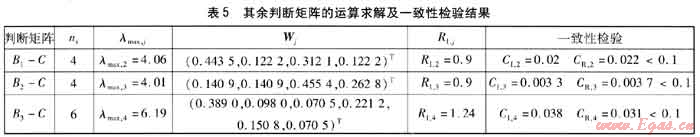 當(dāng)CR,1<0.1時(shí),說明此時(shí)判斷矩陣有可以接受的一致性。其余判斷矩陣(表2~4)的運(yùn)算求解及一致性檢驗(yàn)見表5。
