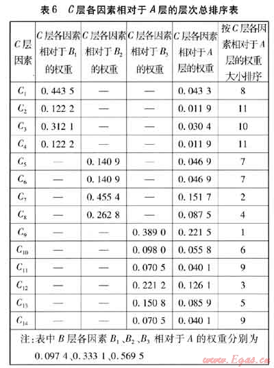 可見,C層各因素相對于A層層次總排序的計(jì)算結(jié)果滿足一致性,否則,需要重新調(diào)整判斷矩陣,直至滿足一致性。