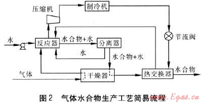 利用水合物形式進行氣體儲存的研究主要涉及到以下兩種技術,一是利用水合物儲運天然氣或煤層氣的技術[21~23],二是水合物儲氫技術。水合物儲運天然氣技術已在日本進入應用實施階段[24]。圖2為氣體水合物生產(chǎn)工藝簡易流程。氣體經(jīng)干燥器干燥凈化后與水在反應器中生成水合物、水的混合物。從反應器出來的混合物進入分離器,在分離器中進行初步分離。分離出的少量純水由分離器下部引出,由于這部分水有一種保持晶體結(jié)構(gòu)的趨勢,故重新循環(huán)進入反應器;分離后得到的水合物經(jīng)干燥器干燥,并經(jīng)熱交換器進一步降溫后得到成品水合物。氣體則從反應器排出后先進行壓縮,提高氣體壓力,再經(jīng)制冷機和節(jié)流閥進行降溫處理,再回收重新利用。目前水合物儲氫技術尚處于探索階段。