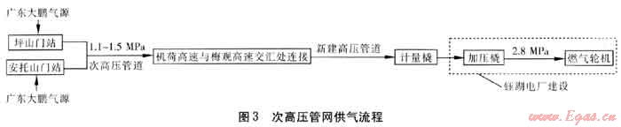 該方案綜合考慮西二氣到來后將使用的天然氣高壓管道與目前的天然氣次高壓管道,利用已建成的高壓管道與次高壓管道連接,通過次高壓管道供應(yīng)電廠。高壓管道的設(shè)計(jì)壓力為6.0MPa,運(yùn)行壓力為4.0MPa;次高壓管道的設(shè)計(jì)壓力為1.6MPa,門站出站運(yùn)行壓力為1.5MPa。在建的機(jī)荷高速、坂雪大道、環(huán)觀南路、平大路的高壓管道與煙廠調(diào)壓站后梅觀高速的次高壓管道連通后,即可通過該管道供應(yīng)電廠,全長約13.6km,其中尚需建設(shè)部分為6.42km,從工期上來說,可以滿足需求。電廠內(nèi)需建設(shè)計(jì)量橇、加壓橇。工藝流程見圖3。